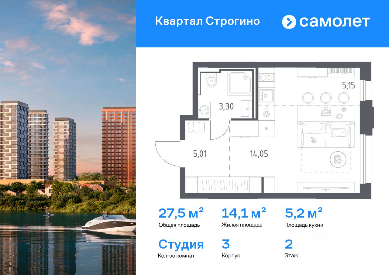 Строим кварталы для жизни с заботой о будущем. Предлагается квартира студия комфорт-класса 27,51 кв.м в корпусе 3 на 2 этаже, в ЖК "Квартал Строгино"