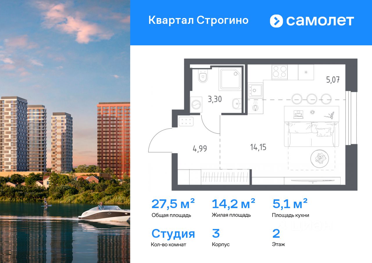 Строим кварталы для жизни с заботой о будущем. Предлагается квартира студия комфорт-класса 27,51 кв.м в корпусе 3 на 2 этаже, в ЖК "Квартал Строгино"