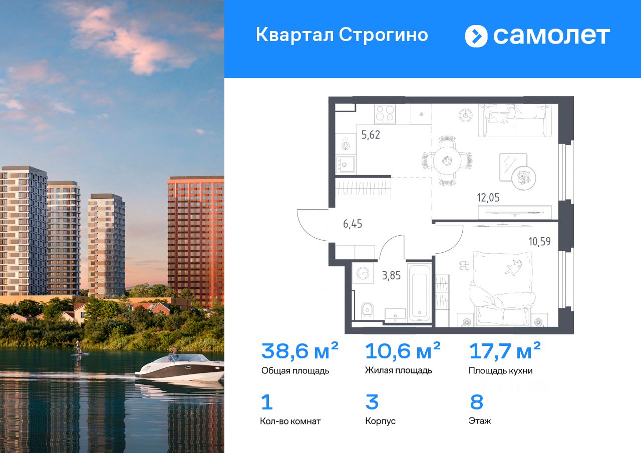 Строим кварталы для жизни с заботой о будущем. Предлагается 1-комнатная квартира комфорт-класса 38,56 кв.м в корпусе 3 на 8 этаже, в ЖК "Квартал Строгино"