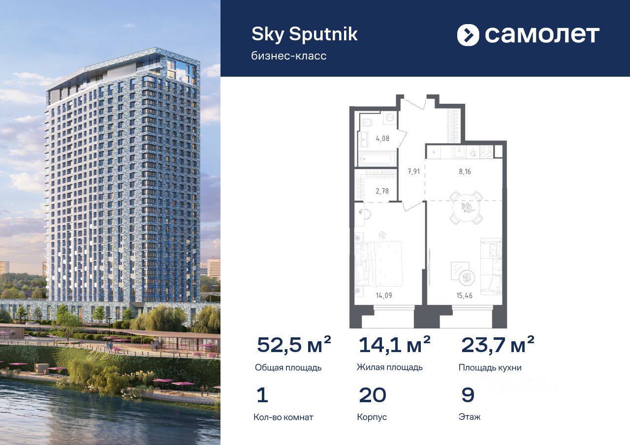 Строим кварталы для жизни с заботой о будущем. Предлагаются 1-комнатные апартаменты бизнес-класса 52,48 кв.м в корпусе 20 на 9 этаже, в Sky Sputnik