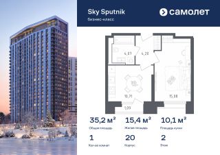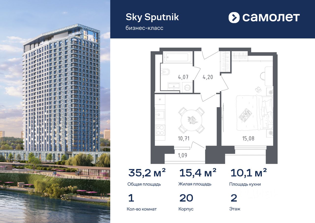 Строим кварталы для жизни с заботой о будущем. Предлагаются 1-комнатные апартаменты бизнес-класса 35,15 кв.м в корпусе 20 на 2 этаже, в Sky Sputnik