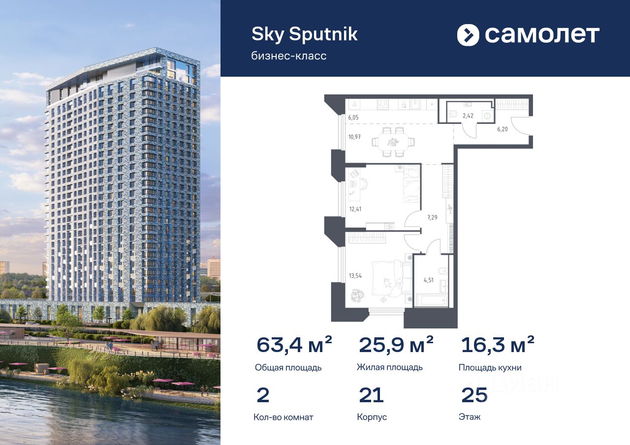 Строим кварталы для жизни с заботой о будущем. Предлагаются 2-комнатные апартаменты бизнес-класса 63,39 кв.м в корпусе 21 на 25 этаже, в Sky Sputnik