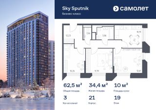 Строим кварталы для жизни с заботой о будущем. Предлагаются 3-комнатные апартаменты бизнес-класса 62,5 кв.м в корпусе 21 на 19 этаже, в Sky Sputnik