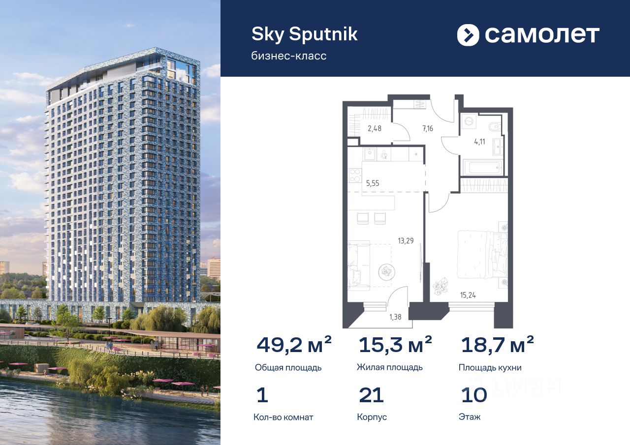 Строим кварталы для жизни с заботой о будущем. Предлагаются 1-комнатные апартаменты бизнес-класса 49,21 кв.м в корпусе 21 на 10 этаже, в Sky Sputnik