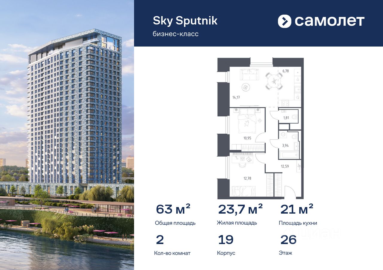 Строим кварталы для жизни с заботой о будущем. Предлагаются 2-комнатные апартаменты бизнес-класса 63,02 кв.м в корпусе 19 на 26 этаже, в Sky Sputnik