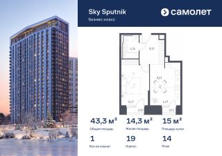 Строим кварталы для жизни с заботой о будущем. Предлагаются 1-комнатные апартаменты бизнес-класса 43,29 кв.м в корпусе 19 на 14 этаже, в Sky Sputnik