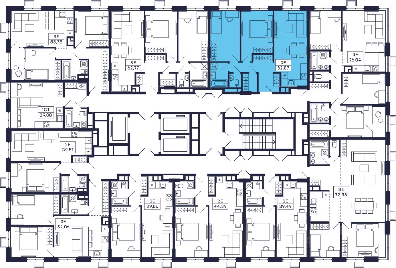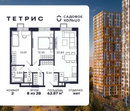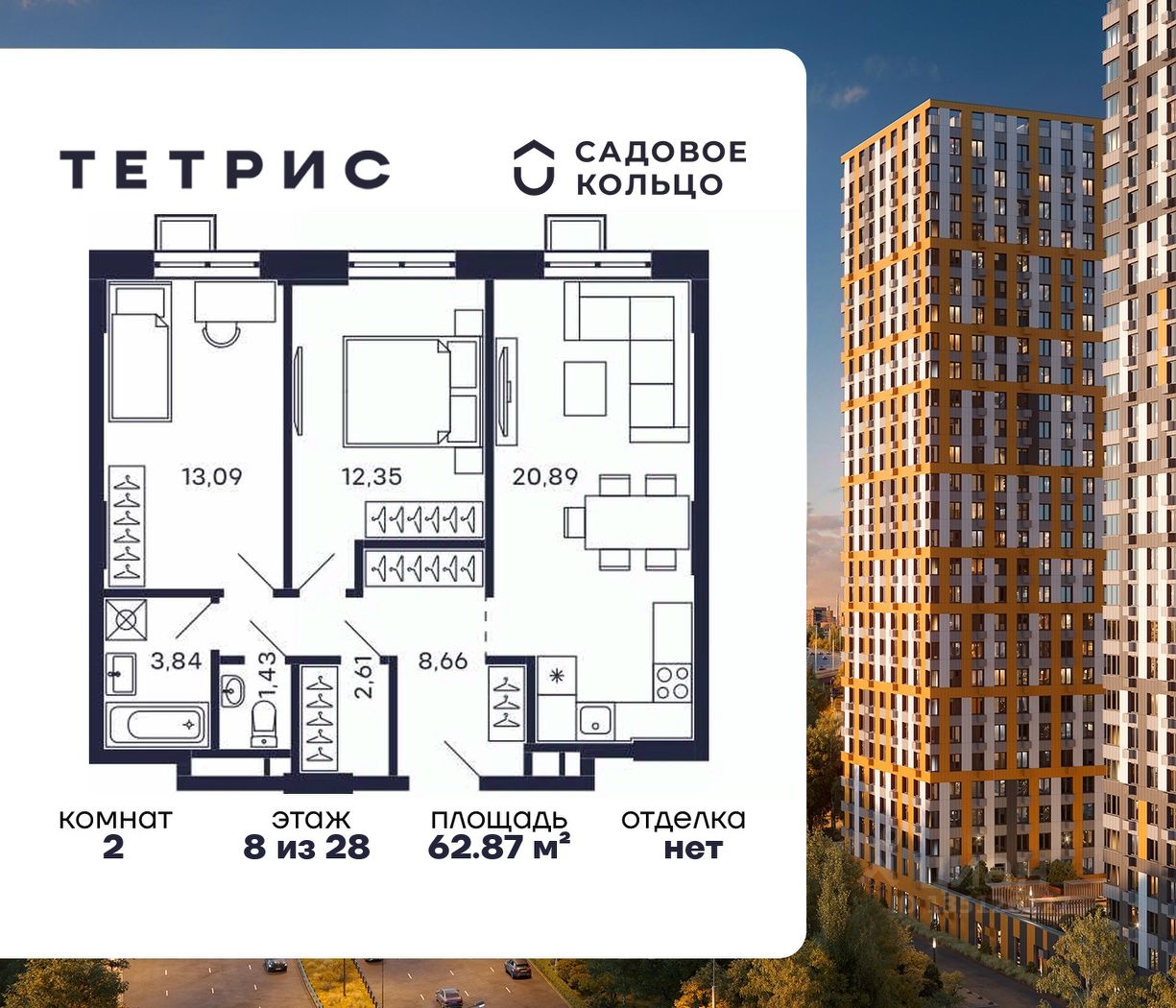 Продается квартира в ЖК Тетрис с 2 спальнями на 8 этаже 28 этажного дома. Общая площадь: 62.87 кв.м. Высота потолков 2.95 м. Срок сдачи 2 квартал 2026 г. Эскроу-счет. Застройщик ГК "Садовое кольцо".
