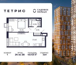 Продается квартира в ЖК Тетрис с 1 спальней на 24 этаже 28 этажного дома. Общая площадь: 43.43 кв.м. Высота потолков 2.95 м. Срок сдачи 2 квартал 2026 г. Эскроу-счет. Застройщик ГК "Садовое кольцо".