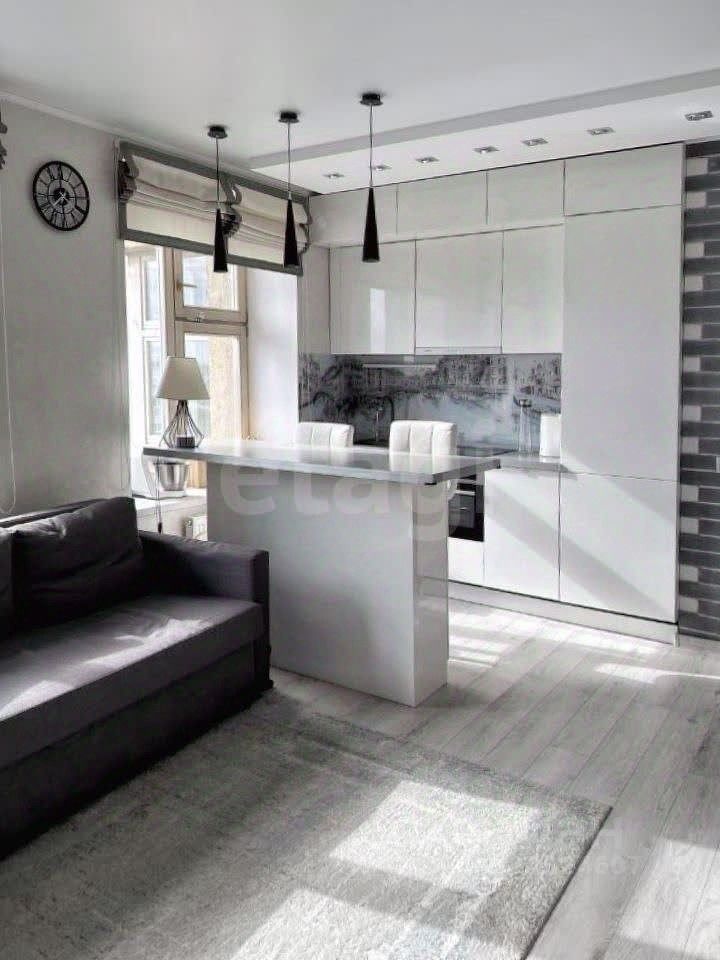 Современный ремонт, большая гостиная, зона для кухни со всеми удобствами и встроенной техникой создадут уют и комфорт для проживания и приёма гостей.