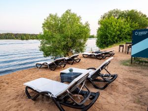 Детская часть территории — место для веселых игр. Здесь есть 2 площадки с песочницами и качелями, батуты и даже канатный комплекс!