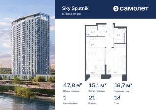 Строим кварталы для жизни с заботой о будущем. Предлагаются 1-комнатные апартаменты бизнес-класса 47,83 кв.м в корпусе 21 на 13 этаже, в Sky Sputnik