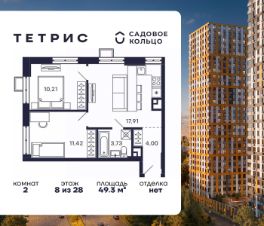 Продается квартира в ЖК Тетрис с 2 спальнями на 8 этаже 28 этажного дома. Общая площадь: 49.3 кв.м. Высота потолков 2.95 м. Срок сдачи 2 квартал 2026 г. Эскроу-счет. Застройщик ГК "Садовое кольцо".