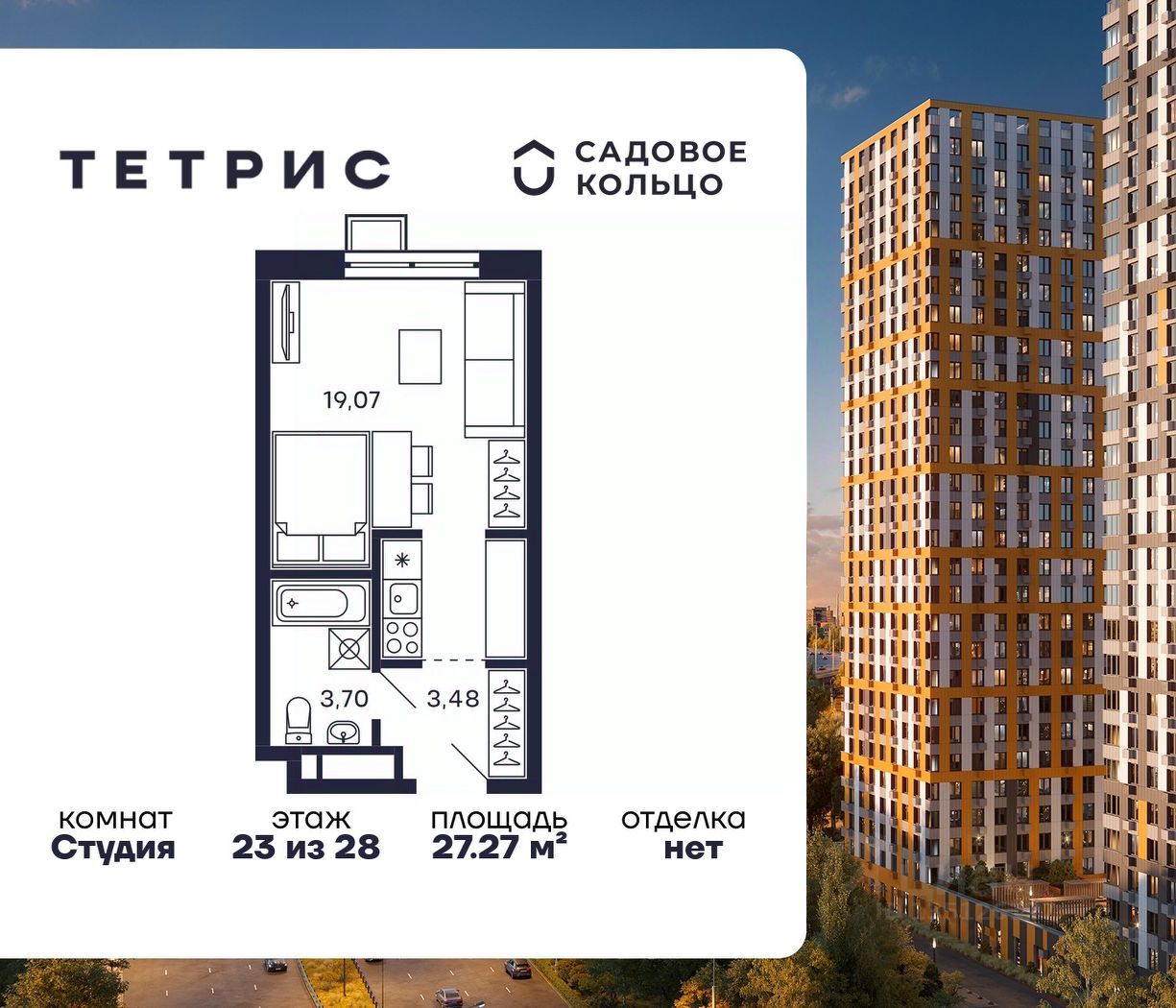 Продается квартира в ЖК Тетрис студия на 23 этаже 28 этажного дома. Общая площадь: 27.27 кв.м. Высота потолков 2.95 м. Срок сдачи 2 квартал 2026 г. Эскроу-счет. Застройщик ГК "Садовое кольцо".