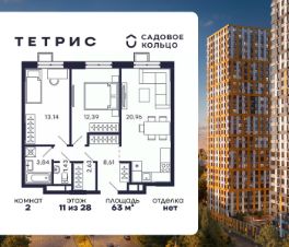 Продается квартира в ЖК Тетрис с 2 спальнями на 11 этаже 28 этажного дома. Общая площадь: 63 кв.м. Высота потолков 2.95 м. Срок сдачи 2 квартал 2026 г. Эскроу-счет. Застройщик ГК "Садовое кольцо".