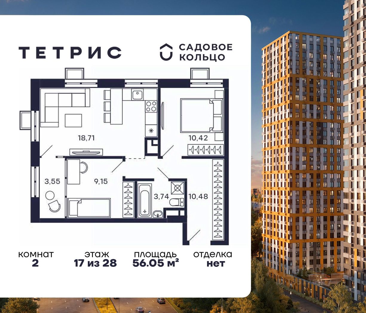 Продается квартира в ЖК Тетрис с 2 спальнями на 17 этаже 28 этажного дома. Общая площадь: 56.05 кв.м. Высота потолков 2.95 м. Срок сдачи 2 квартал 2026 г. Эскроу-счет. Застройщик ГК "Садовое кольцо".