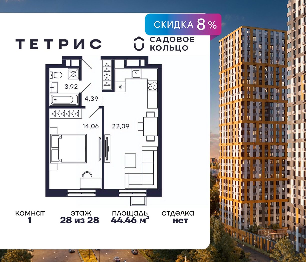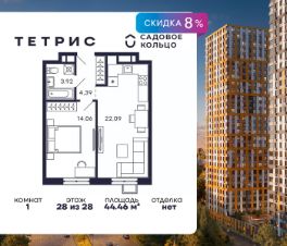 Продается квартира в ЖК Тетрис с 1 спальней на 28 этаже 28 этажного дома. Общая площадь: 44.46 кв.м. Высота потолков 2.95 м. Срок сдачи 2 квартал 2026 г. Эскроу-счет. Застройщик ГК "Садовое кольцо".