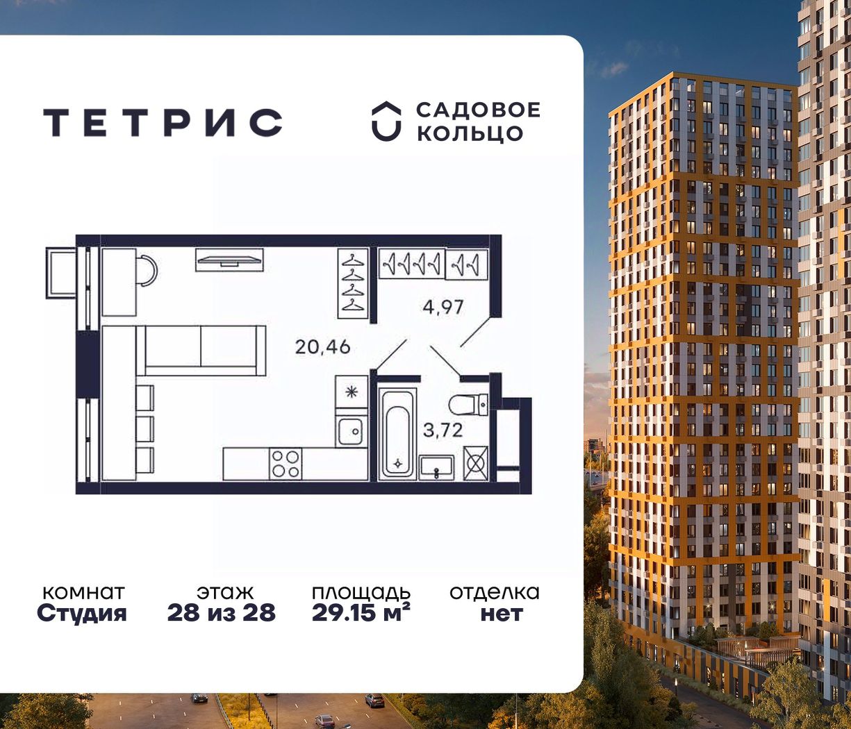 Продается квартира в ЖК Тетрис студия на 28 этаже 28 этажного дома. Общая площадь: 29.15 кв.м. Высота потолков 2.95 м. Срок сдачи 2 квартал 2026 г. Эскроу-счет. Застройщик ГК "Садовое кольцо".