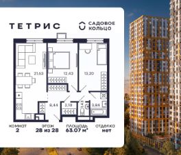 Продается квартира в ЖК Тетрис с 2 спальнями на 28 этаже 28 этажного дома. Общая площадь: 63.07 кв.м. Высота потолков 2.95 м. Срок сдачи 2 квартал 2026 г. Эскроу-счет. Застройщик ГК "Садовое кольцо".
