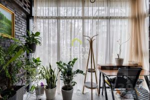 Застекленная лоджия с панорамными окнами и выходом на балкон превращена в уютное пространство для отдыха или работы — здесь особенно приятно встречать утро и наслаждаться видом на зелень двора.