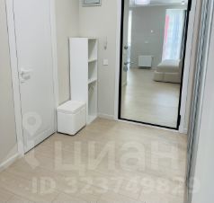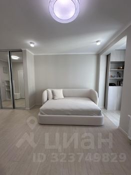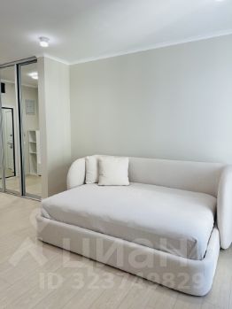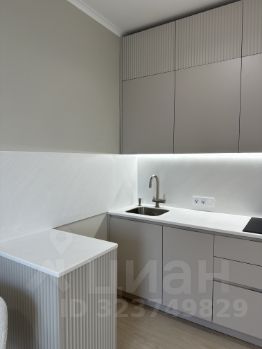 ЖК Самолёт -Спутник - студия 32.4 кв.м со всей мебелью: кухня, двухспальная кровать с внутренним хранением, шкафы для хранения, обеденный стол и стулья.