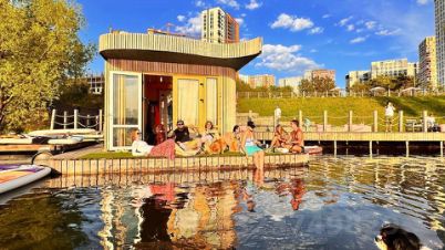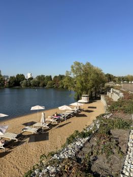 Летом открытый пляж с лежаками и спортивный инвентарь для проката.