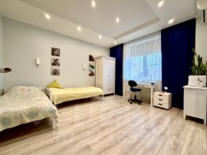 Полностью укомплектованная мебелью и техникой кухня-гостиная с зонами кухни 12,3 кв.метров, обеденной и отдыха 19,9 кв.метров. Три отдельные комнаты: две детские 18,9 кв.метров и 15 кв.метров с установленным камином. Спальня 14,2 кв.метров с гардеробной 4,2 кв.метра..