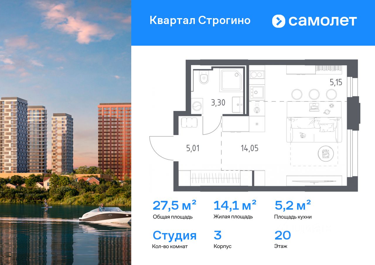 Строим кварталы для жизни с заботой о будущем. Предлагается квартира студия комфорт-класса 27,51 кв.м в корпусе 3 на 20 этаже, в ЖК "Квартал Строгино"