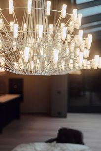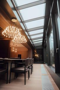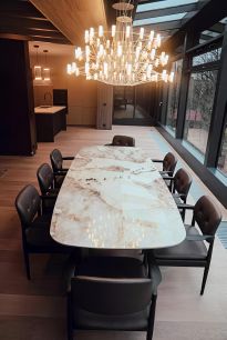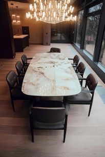 Интерьер выполнен по авторскому дизайн-проекту: натуральные материалы, мебель из Италии, панорамные окна, потолки 3,5 м.