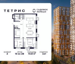Продается квартира в ЖК Тетрис с 2 спальнями на 13 этаже 28 этажного дома. Общая площадь: 72.8 кв.м. Высота потолков 2.95 м. Срок сдачи 2 квартал 2026 г. Эскроу-счет. Застройщик ГК "Садовое кольцо".