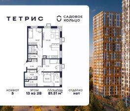 Продается квартира в ЖК Тетрис с 3 спальнями на 13 этаже 28 этажного дома. Общая площадь: 81.31 кв.м. Высота потолков 2.95 м. Срок сдачи 2 квартал 2026 г. Мастер-спальня. Вид на парк. Эскроу-счет. Застройщик ГК "Садовое кольцо".
