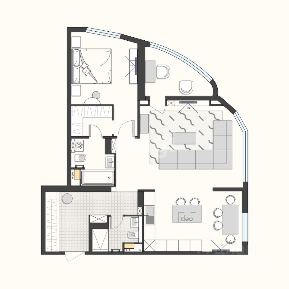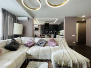 Площадь отличается продуманной функциональной планировкой: просторная гостиная совмещена с кухней, изолированная спальня с гардеробной и собственной ванной комнатой, а также гостевой санузел. В квартире выполнен дизайнерский ремонт с использованием экологичных материалов премиального сегмента. Полы с подогревом на кухне, в коридоре, санузлах и на утепленном балконе, который можно использовать как дополнительное жилое пространство или кабинет. Встроенная кухня с керамическими фасадами, островом и техникой ведущих брендов (кофемашина, духовой шкаф, индукционная панель, посудомоечная и стирально-сушильная машины). Санузлы отделаны керамогранитом и оснащены итальянской сантехникой, в каждом установлены проточные бойлеры.