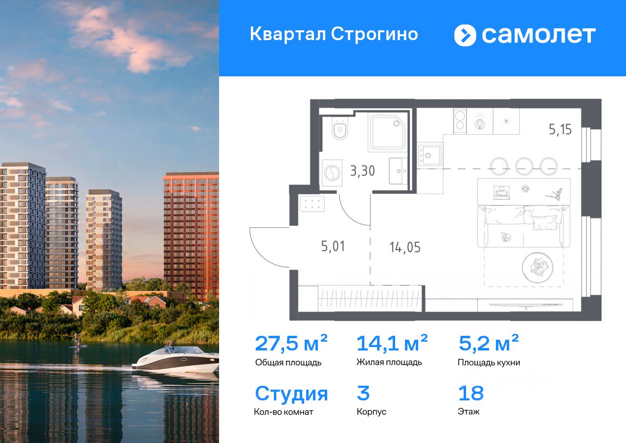 Строим кварталы для жизни с заботой о будущем. Предлагается квартира студия комфорт-класса 27,51 кв.м в корпусе 3 на 18 этаже, в ЖК "Квартал Строгино"