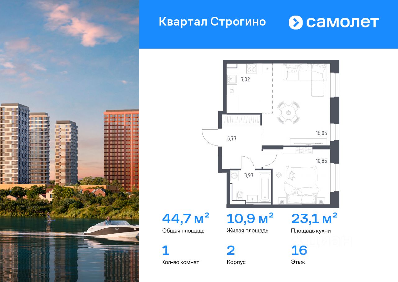 Строим кварталы для жизни с заботой о будущем. Предлагается 1-комнатная квартира комфорт-класса 44,66 кв.м в корпусе 2 на 16 этаже, в ЖК "Квартал Строгино"