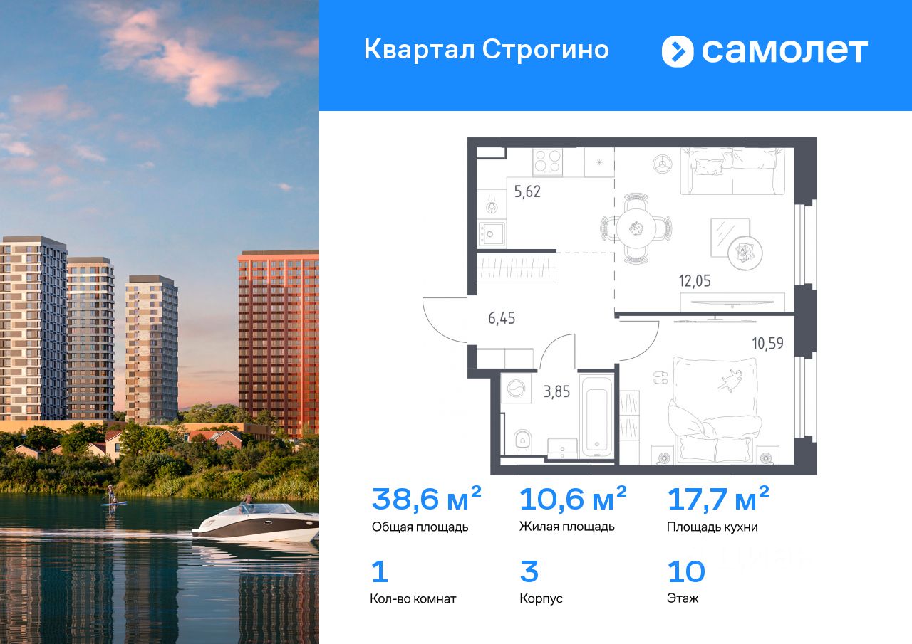 Строим кварталы для жизни с заботой о будущем. Предлагается 1-комнатная квартира комфорт-класса 38,56 кв.м в корпусе 3 на 10 этаже, в ЖК "Квартал Строгино"