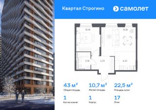 Строим кварталы для жизни с заботой о будущем. Предлагается 1-комнатная квартира комфорт-класса 43,02 кв.м в корпусе 1 на 17 этаже, в ЖК "Квартал Строгино"