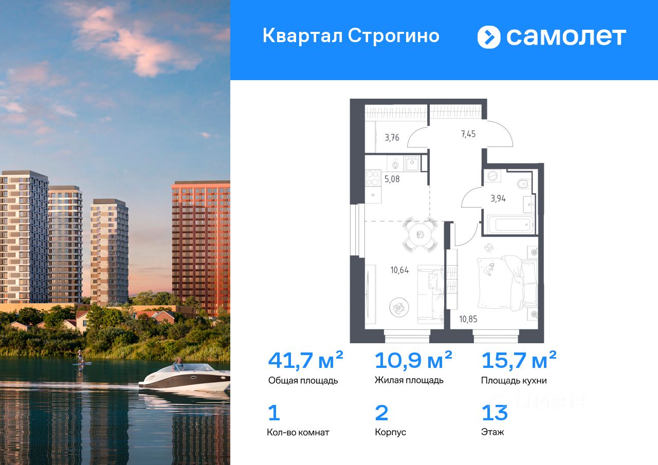 Строим кварталы для жизни с заботой о будущем. Предлагается 1-комнатная квартира комфорт-класса 41,72 кв.м в корпусе 2 на 13 этаже, в ЖК "Квартал Строгино"
