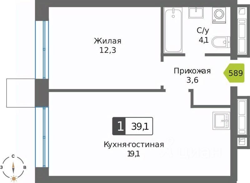 Общая площадь39,1 м²
