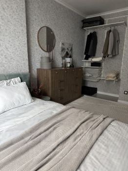 В спальне выделена просторная гардеробная, которая решает вопрос хранения гораздо эффективнее шкафов, шикарная кровать с подъёмным механизмом и большим пространством для хранения.