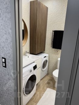 Просторный объединённый с/узел продуман до мелочей - выделена зона для стиральной и сушильной машины, зоны для хранения, удобно расположены розетки.