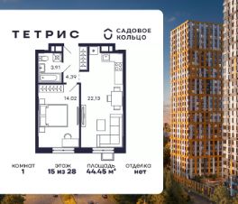 Продается квартира в ЖК Тетрис с 1 спальней на 15 этаже 28 этажного дома. Общая площадь: 44.45 кв.м. Высота потолков 2.95 м. Срок сдачи 2 квартал 2026 г. Эскроу-счет. Застройщик ГК "Садовое кольцо".