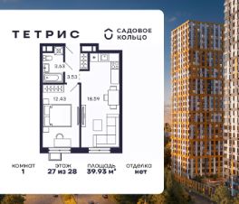 Продается квартира в ЖК Тетрис с 1 спальней на 27 этаже 28 этажного дома. Общая площадь: 39.93 кв.м. Высота потолков 2.95 м. Срок сдачи 2 квартал 2026 г. Эскроу-счет. Застройщик ГК "Садовое кольцо".