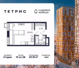 Продается квартира в ЖК Тетрис студия на 19 этаже 28 этажного дома. Общая площадь: 29.15 кв.м. Высота потолков 2.95 м. Срок сдачи 2 квартал 2026 г. Эскроу-счет. Застройщик ГК "Садовое кольцо".