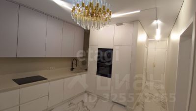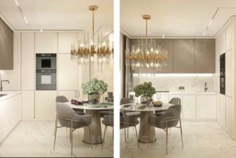 Кухня — из качественных материалов, вся техника встроена. Дизайнерская люстра из 16 ламп создаёт эффектную атмосферу. Кухня плавно переходит аркой в гостиную.