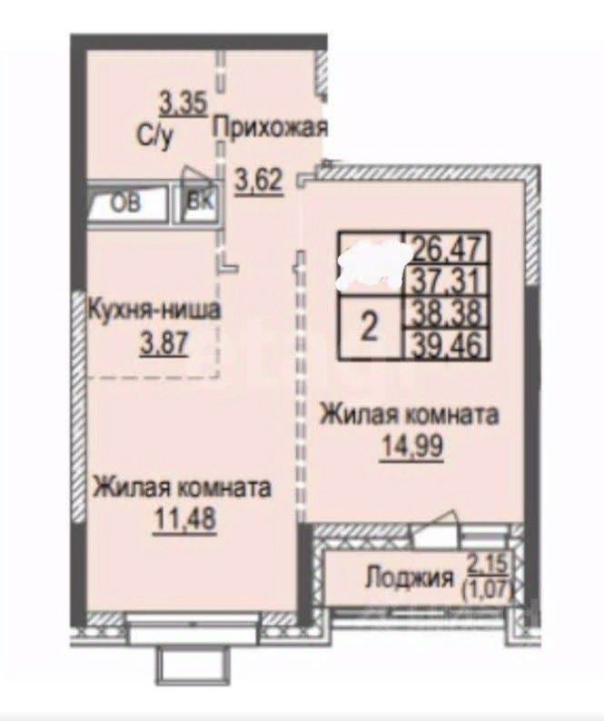 Квартира с лоджией расположена на 15-м этаже 23-этажного монолитного дома общей площадью - 37,3 м².