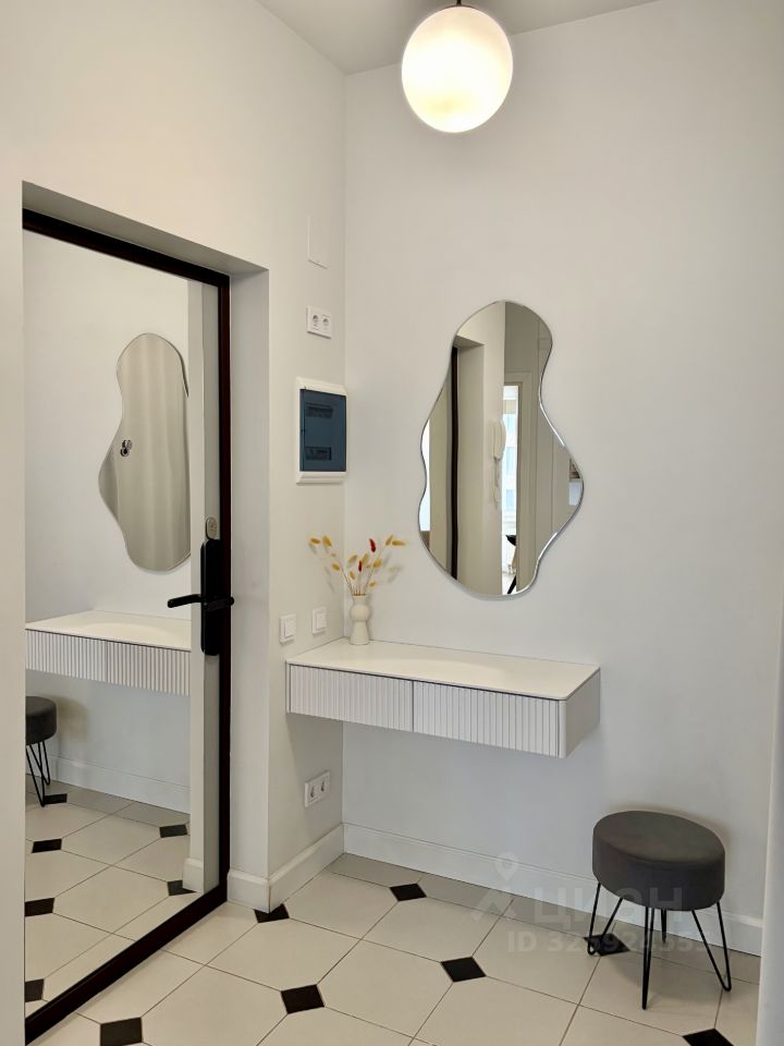 Просторная прихожая с нишей под гардероб до потолка. На входной двери зеркало во весь рост — удобно делать селфи. Роутер спрятан в шкафу.