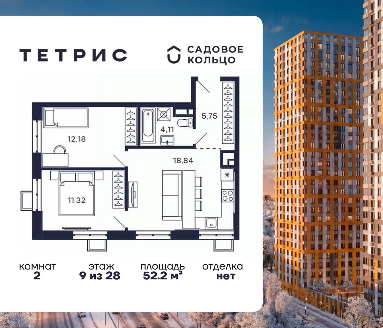 Продается квартира в ЖК Тетрис с 2 спальнями на 9 этаже 28 этажного дома. Общая площадь: 52.2 кв.м. Высота потолков 2.95 м. Срок сдачи 2 квартал 2026 г. Эскроу-счет. Застройщик ГК "Садовое кольцо".
