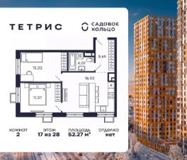 Продается квартира в ЖК Тетрис с 2 спальнями на 17 этаже 28 этажного дома. Общая площадь: 52.27 кв.м. Высота потолков 2.95 м. Срок сдачи 2 квартал 2026 г. Эскроу-счет. Застройщик ГК "Садовое кольцо".
