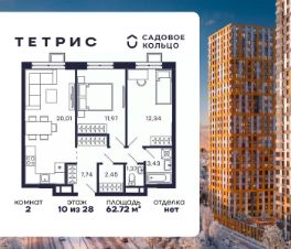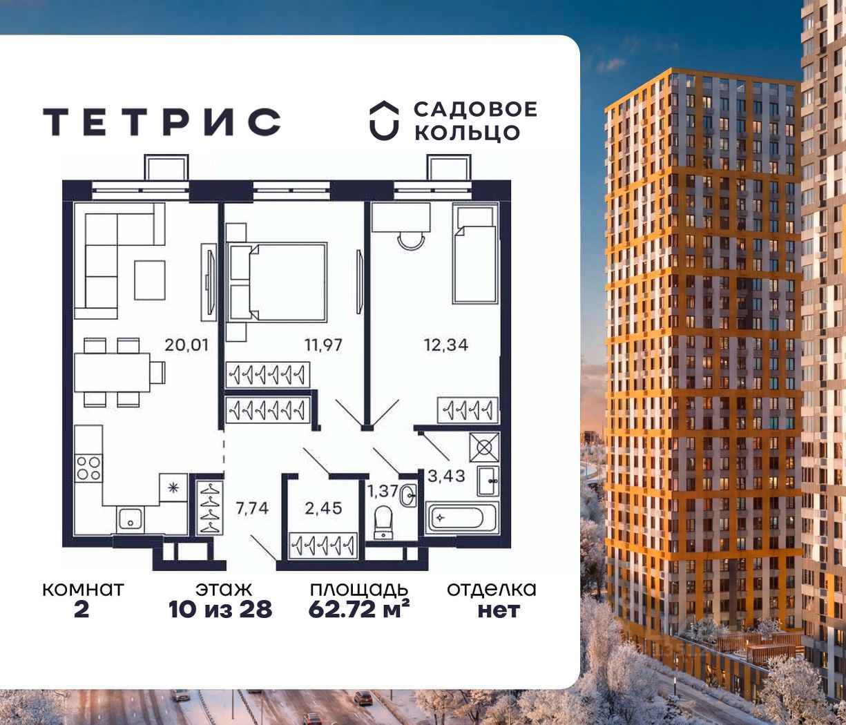 Продается квартира в ЖК Тетрис с 2 спальнями на 10 этаже 28 этажного дома. Общая площадь: 62.72 кв.м. Высота потолков 2.95 м. Срок сдачи 2 квартал 2026 г. Эскроу-счет. Застройщик ГК "Садовое кольцо".