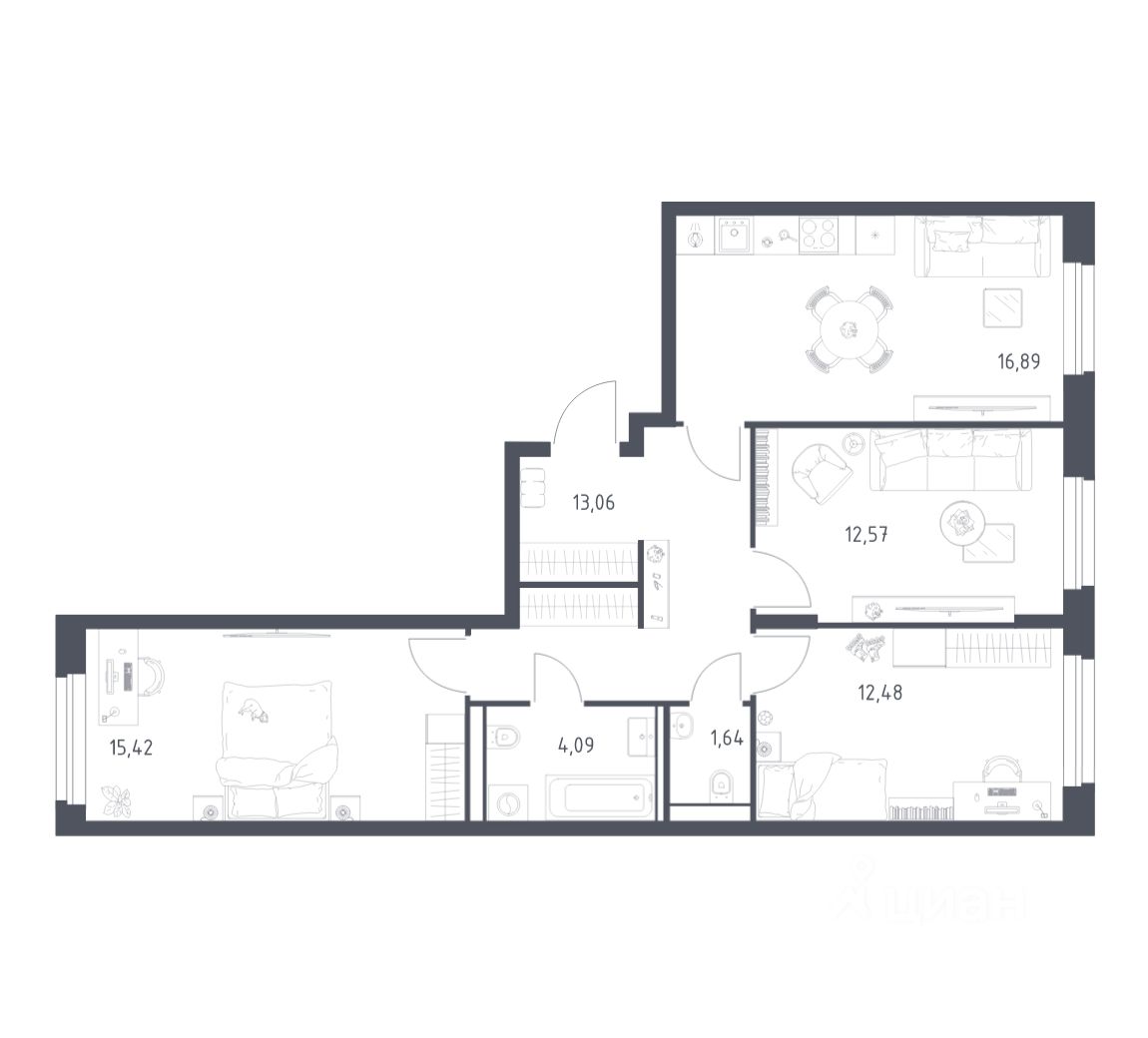 В варианте с готовой отделкой мы поклеили обои под покраску, постелили полы в комнатах и санузлах, выполнили отделку стен. Установили сантехнику и межкомнатные двери, провели электрику. Это лучшее соотношение цены, качества и затраченного времени. Осталось только выбрать место для обеденного стола и удобного дивана.
