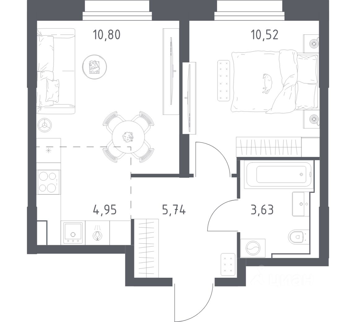 В варианте с готовой отделкой мы поклеили обои под покраску, постелили полы в комнатах и санузлах, выполнили отделку стен. Установили сантехнику и межкомнатные двери, провели электрику. Это лучшее соотношение цены, качества и затраченного времени. Осталось только выбрать место для обеденного стола и удобного дивана.